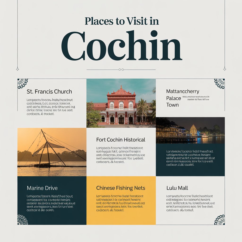 After enjoying breakfast, check out and proceed towards Kochi. On arrival, explore some of the city’s most popular landmarks, including Fort Kochi, St. Francis Church, Mattancherry Palace, the iconic Chinese Fishing Nets, and a scenic drive along Marine Drive. You may also visit Lulu Mall for shopping and refreshments, depending on time availability.