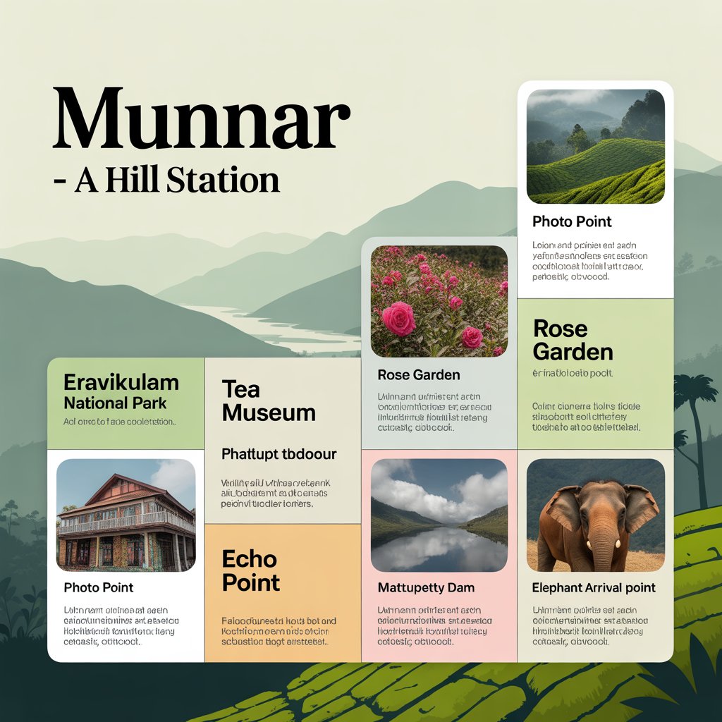 Next, visit the Tata Tea Museum (closed on Mondays) to learn about the history and processing of tea in Munnar, followed by a tea-tasting experience.